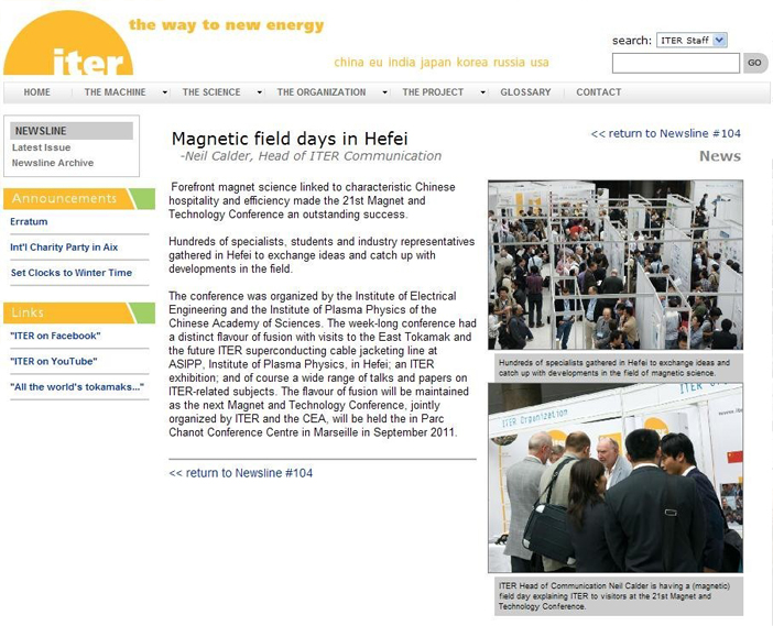 由中科院等离子所与中科院电工所联合主办的“第二十一届国际磁体技术大会” (21st International Conference on Magnet Technology)于2009年10月19日至23日在合肥市召开,该会议被称为国际磁体技术研究及应用领域最重要的学术会议。严陆光院士获得美国电子电气工程师协会应用超导委员会授予的超导应用杰出贡献奖。中科院电工所所长肖立业、中科院等离子体所所长李建刚等参加了大会。本次会议的举办表明我国在国际磁体技术界的地位得到提升,也对我国走向世界磁体技术研究领域前沿起到推动作用。
