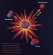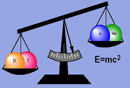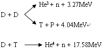 在一定条件下,一个氘核(由一个质子一个中子组成)和一个氚核(由一个质子和二个中子组成)会发生聚变核反应,生成一个氦核(二个质子和二个中子组成),并放出一个中子。精密的测量表明,氦核加上一个中子的质量之和小于一个氘核与氚核反应前的质量之和!发生了明显的质量亏损。根据著名的爱因斯坦质能公式E=mc2,反应过程中出现的质量亏损转化为巨大的能量释放出来。从获得能量的观点来看聚变核反应主要是如下两种: