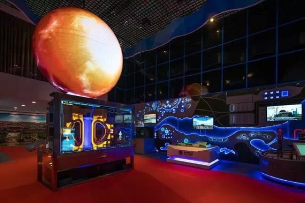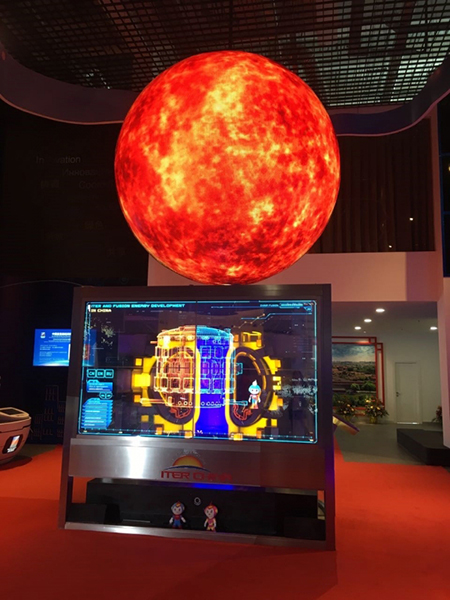 “中国聚变能源开发与ITER计划”的展项由透明互动主屏和侧屏、直径3米的LED显示球以及直径2.4米的ITER装置模型三个部分联合演绎。主屏和侧屏均带有触摸互动功能,演示全部过程中,侧屏、LED球和ITER模型将以不同的画面和形式配合主屏幕的显示,人们可以通过触摸屏幕的“手型区域”点亮挂在空中的“太阳”。