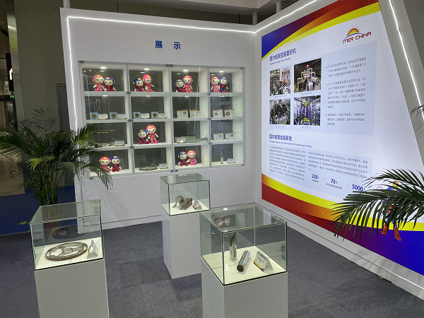 展项展出的国际热核聚变实验堆(ITER)装置模型,依照1:42的比例,对高30米、直径28米、与天坛祈年殿大小相当的ITER装置进行了等比缩小,模型的不同区域可分别点亮,呈现出不同色彩的灯光效果。