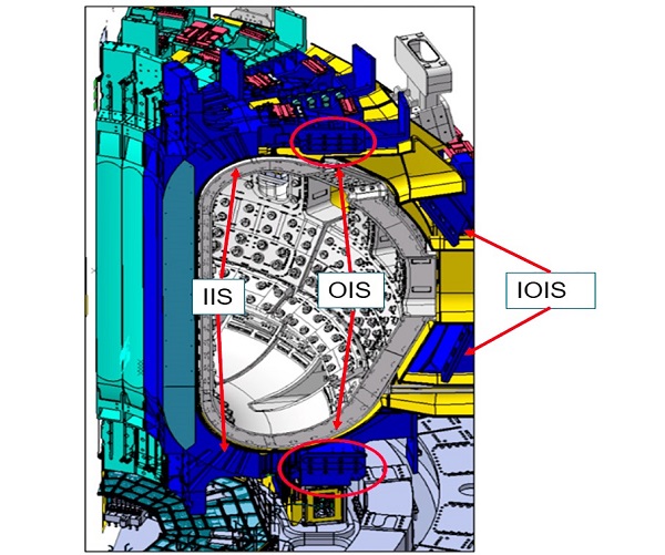 线圈连接共分三个独立区域,采用三类专用构件协同完成:装置内侧上下各两组内侧线圈间结构(IIS)、外侧上下两端的外侧线圈间结构(OIS),以及中部高度的两组中部外侧线圈间结构(IOIS),多点位连接全面保障整体结构强度,适配聚变运行中的复杂受力场景。