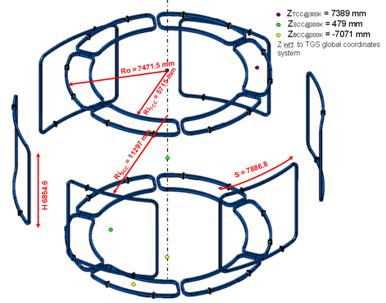 SCC布置在环向占位36.195°,横跨2个纵场线圈,线圈匝数为20,绕组外形尺寸约8m*8m,绕组重约1.22吨,整个线圈(包括线圈盒)重约3.65吨。