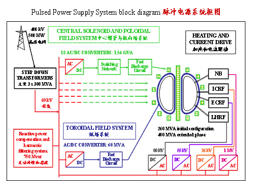 ITER装置的托卡马克设备及其所有基础设施的运行,全部依靠400kV供电网络提供给脉冲电源系统和稳态电源系统能量来实现。根据中国政府和ITER组织之间的协议(2001 baseline),中国将提供400kV 高压变电站中的所有设备。其中脉冲电源系统如下图所示:
