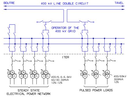 ITER脉冲负载的专用高压变电站,按照2001年基准设计,由379件各种规格的变压器和开关等设备组成。其中最大的设备是三台400kV/69kV主变压器和400kV,69kV 等级的各种高压开关及其控制、测量、保护装置等。