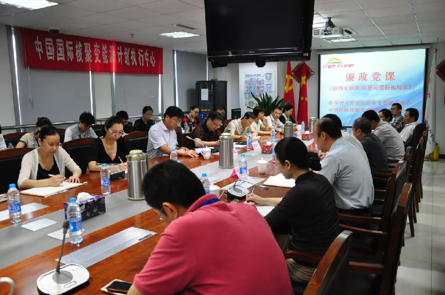 本次廉政党课积极响应党风廉政建设和科技部“三严三实”专题教育工作,是对全体党员干部和科技干部的一次深刻教育。监管服务中心戴国庆主任、刘东金副主任、孙晓芸副主任,ITER中心罗德隆常务副主任、孙键副主任和赵静副主任参加了学习。