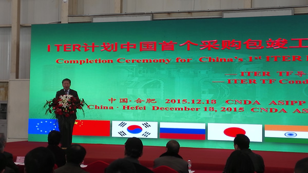 随着竣工锣的敲响,ITER计划中国首个采购包顺利竣工。12月18日上午9时,ITER计划中国首个采购包竣工仪式在合肥举行。ITER环向场(TF)导体采购包的顺利竣工,标志着ITER计划中国首个采购包圆满完成。ITER组织导体部门负责人阿诺 戴维,科技部原副部长、中国国际核聚变能源计划执行中心主任曹健林同志,常务副主任罗德隆,安徽省科技厅副厅长罗平,中科院合肥物质科学研究院副院长万宝年以及TF导体采购包15家合作单位共100多人参加了本次竣工仪式。