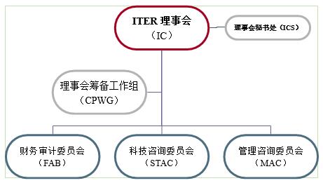 《组织协定》中明确规定,理事会可根据工作需要,建立相应的辅助机构,为理事会提供咨询和建议。ITER理事会曾设有如下附属机构:管理咨询委员会(Management Advisory Committee,MAC)、科技咨询委员会(Science and Technology Advisory Committee,STAC)、财务审计委员会(Financial Audit Board,FAB)、负责理事会日程事务的管理与协调的筹备工作组(Council Preparatory Working Group,CPWG)、出口控制与核不扩散工作组(Export Control and Non-Proliferation Working Group,ECWG)、知识产权工作组(Intellectual Property Management and Disseminiation of Information Working Group, IPWG)以及测试包层模块项目委员会(Text Blanket Module Program Committee, TBM-PC)。而后,ITER理事会根据实际工程进展对附属机构进行了调整,如:ECWG及IPWG在制定ITER出口控制与核不扩散、知识产权政策后,已经完成理事会交办的任务,便从各方政府主管部门派员组成的工作组改为由ITER组织及各DA派员组成的工作层联络组;TBM-PC也根据实际工作调整,在完成了理事会交办的一系列任务后,改为由ITER组织牵头的工作组。目前,理事会及其附属机构设置如下: