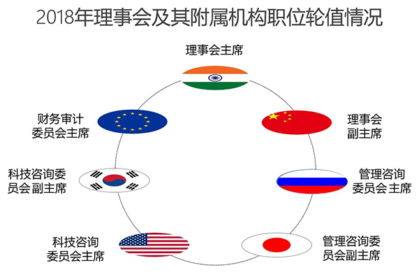 ITER理事会及其附属机构MAC、STAC的主席和副主席及FAB主席共七个高层职位由ITER计划七方各派一人担任,并按照一定顺序在七方进行周期性轮换,每一届主席及副主席任期一年,经理事会批准后可续任3次,总任期不超过4年。根据目前理事会及其附属机构的实际轮值情况,主席及副主席的总任期一般为两年(1年+1年续任)。2007年11月召开的ITER第一届理事会任命了首任轮值主席及副主席,而后按照每两年更新一次的安排在七个成员方中轮值。这就为各方通过各自轮值主席从不同层面上影响ITER计划提供了机会。自2018年1月1日起,ITER理事会及其附属机构主席、副主席轮值情况如下: