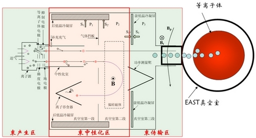将事先加速到很高能量的离子束变成高能中性粒子束,然后再注入到等离子体中,高能中性粒子通过跟背景等离子体碰撞变成高能离子而被捕获,再经过库仑碰撞而热化,同时将能量传递给电子和离子,从而达到给等离子体整体加热的目的,这个过程就称为中性束注入加热(Neutral Beam Injection Heating,简称NBIH)。图1是中性束注入系统的工作基本原理图。
