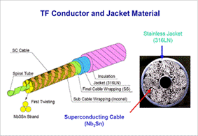 ITER磁体系统由四个主要的子系统组成:18个环向场(Toroidal Field, 简称TF)线圈,中心螺线管(Central Solenoid,简称CS),6个极向场(Poloidal Field, PF)线圈和校正场线圈(Correction Coil, 简称CC)。其中每个TF线圈由5个主双饼(rDP)和2个侧双饼(sDP)组成,而每个双饼均由单根Nb3Sn基股线的管内电缆导体(CICC)绕成。一个rDP单元长度最少需要760m无损电缆,一个sDP单元长度最少需要415m无损电缆。总的来说,制造18个TF线圈总共需要90个rDP导体单元长度和36个sDP导体单元长度。TF导体内流动着4.2K(-269℃)的液氦,额定电流68kA,最大磁场强度达12T,约为地球磁场的20万倍。根据中国与ITER组织签署的采购安排协议,中国将为ITER制造6根主导体和5根侧导体。