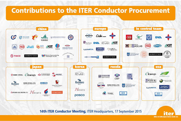 2015年9月15-17日,ITER计划导体工作组最后一次会议在ITER组织总部法国卡达哈什召开。来自ITER组织和6个成员国(中国、欧盟、日本、韩国、俄罗斯和美国)的代表出席会议。会议汇报了各方导体制造进度并总结了导体制造过程中的经验和教训。截至目前,70%的单元长度导体被ITER组织接收。自2008年以来,持续8年、史上极具挑战性的、为ITER磁体提供强大磁场的超导体制造任务接近尾声。