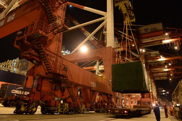 图为2015年5月中国承担制造的ITER极向场线圈部件——PF5导体在上海港装船
