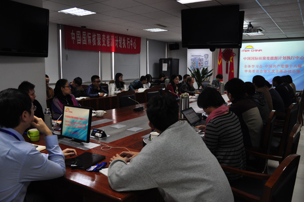 会议传达了中国共产党第十八届中央委员会第五次全体会议的会议精神。罗主任带领中心全体人员仔细研读了《中国共产党第十八届中央委员会第五次全体会议公报》(以下简称“《公报》”)。针对《公报》中“深入实施创新驱动发展战略,发挥科技创新在全面创新中的引领作用,实施一批国家重大科技项目,在重大创新领域组建一批国家实验室,积极提出并牵头组织国际大科学计划和大科学工程”,会议指出,ITER计划作为国际大科学工程,与“十三五规划”密切相关。“十三五”规划的内容不仅与中心员工的工作密切相关,更关系到中心下一个五年的发展方向。
