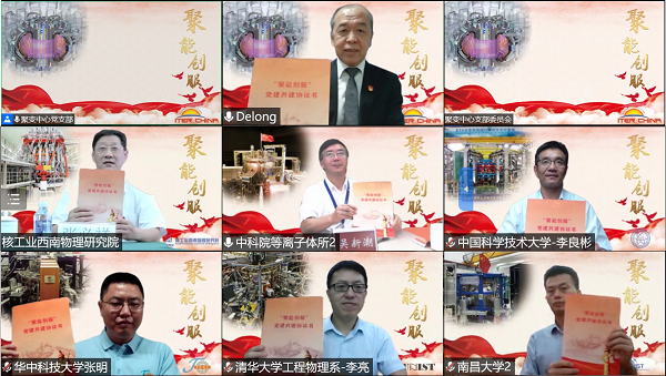 为充分发挥党建工作对我国核聚变事业的引领作用,进一步强化基层党组织的政治功能和战斗堡垒作用,7月28日,核聚变中心党支部与国内核聚变领域六家单位党组织联合开展“聚能创服”党建共建签约活动,活动以线上方式开展。核聚变中心党支部书记、主任罗德隆、核工业西南物理研究院党委书记张必祥、中国科学院等离子体物理研究所党委书记吴新潮、中国科学技术大学核科学技术学院党委书记李良彬、华中科技大学电气与电子工程学院党委书记张明、清华大学工程物理系党委副书记李亮、南昌大学物理与材料学院党委书记王涵林出席签约仪式。