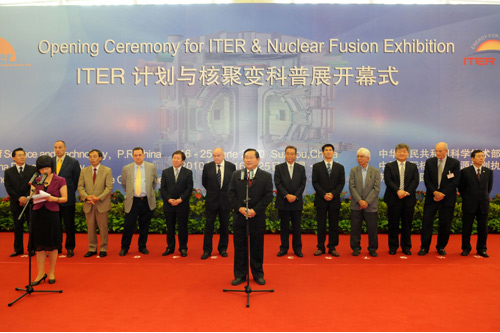 展览于6月16日ITER组织第六届理事会会议开幕前开幕。万钢部长在展览开幕式讲话中强调,我国ITER计划国内任务的顺利实施以及将来在ITER装置上的科学研究,将有力推动我国国内核聚变能的研究发展,为未来我国自主设计、建造核聚变示范堆乃至商用示范堆奠定知识、技术和人才基础。